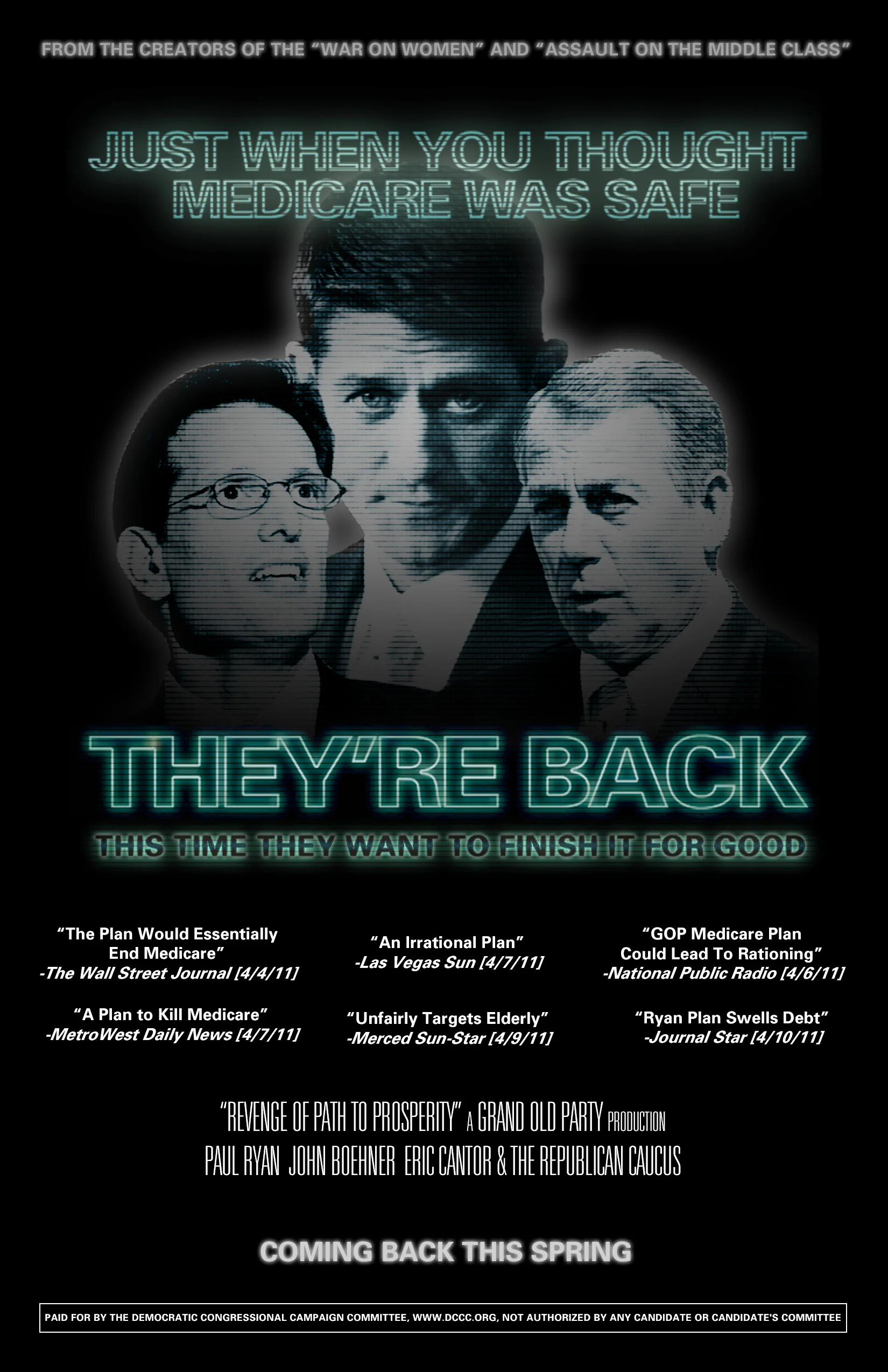 I created this poster for the Democratic Congressional Campaign Committee in 2012. The original Ryan Budget introduced 2011 was framed as "the end of Medicare as we know it" so portraying the 2012 version as a sequel to a horror movie felt apt.